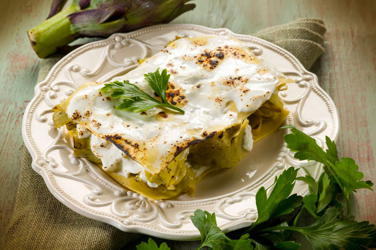 Cospargiamo la base di una pirofila rettangolare di medie dimensioni con un cucchiaio di besciamella. Adagiamo sopra uno strato di sfoglie di pasta precedentemente cotte e copriamo con besciamella, carciofi saltati e provola. Alterniamo i vari ingredienti fino a esaurirli, poi ultimiamo con una generosa spolverata di formaggio grattugiato.